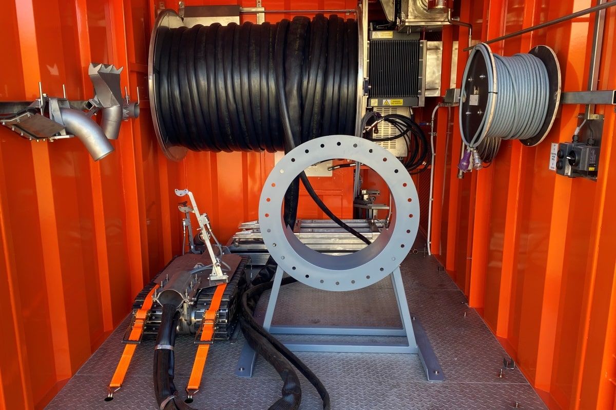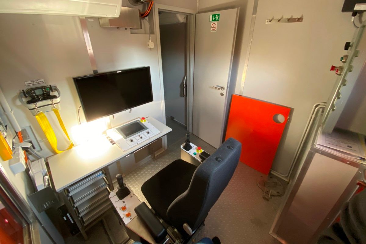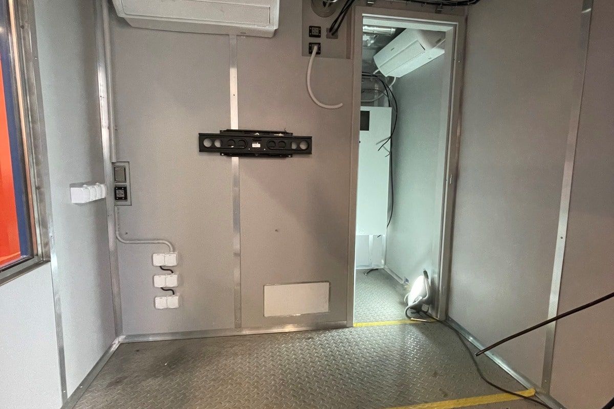 On the pictures below you can see the cabin with the insulation and the panelling is done and insulation is installed. This helps to create a safe and sound proof environment for the operator, along with the installed air conditioning units (ESOT System) the operator finds himself always in a room which is optimal for their performance. The containers are also equipped with a power pack which feeds the robot. There is a separate section in the container solely for storage of the umbilical cord, robot and all accessories which could be needed on the job.