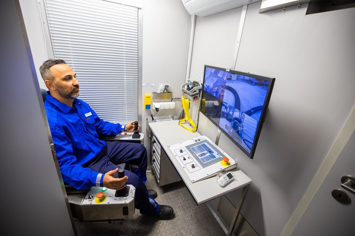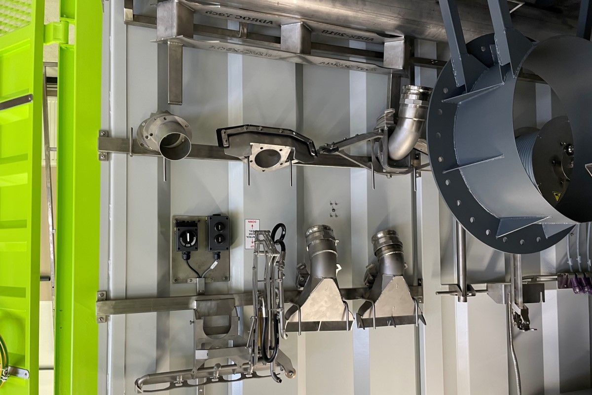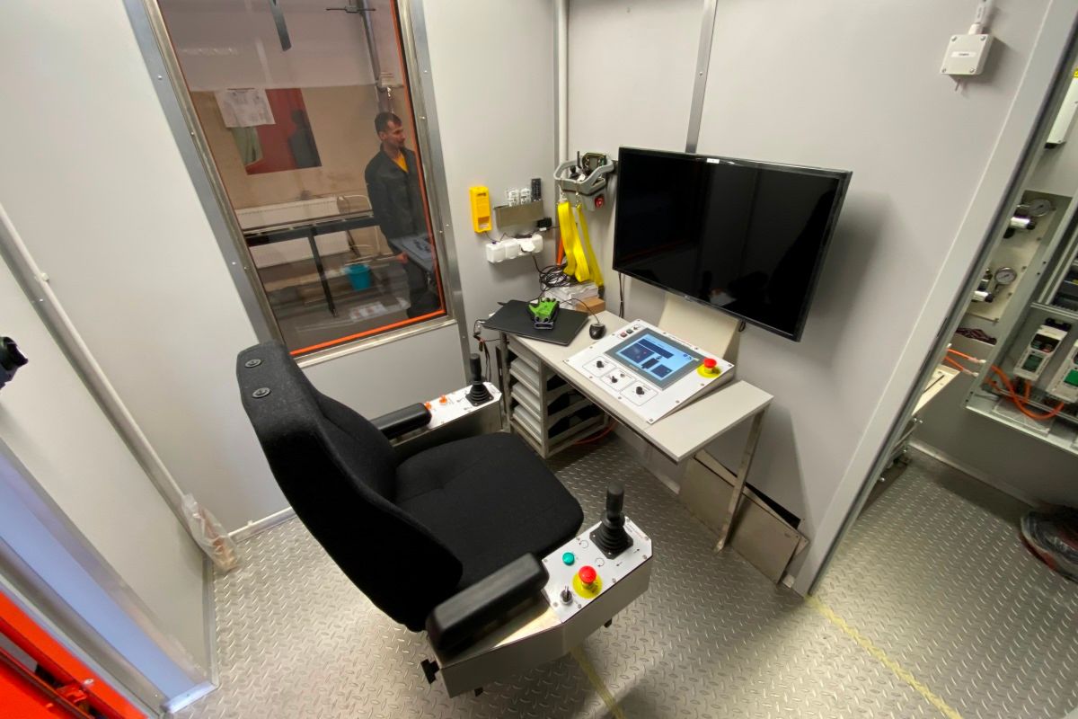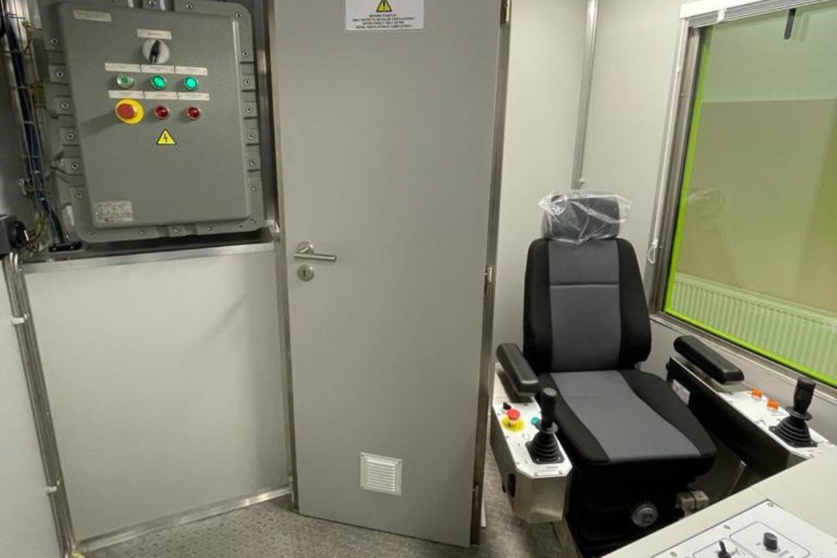 On the pictures below you can see the cabin with the insulation and the panelling is done and insulation is installed. This helps to create a safe and sound proof environment for the operator, along with the installed air conditioning units (ESOT System) the operator finds himself always in a room which is optimal for their performance. The containers are also equipped with a power pack which feeds the robot. There is a separate section in the container solely for storage of the umbilical cord, robot and all accessories which could be needed on the job.